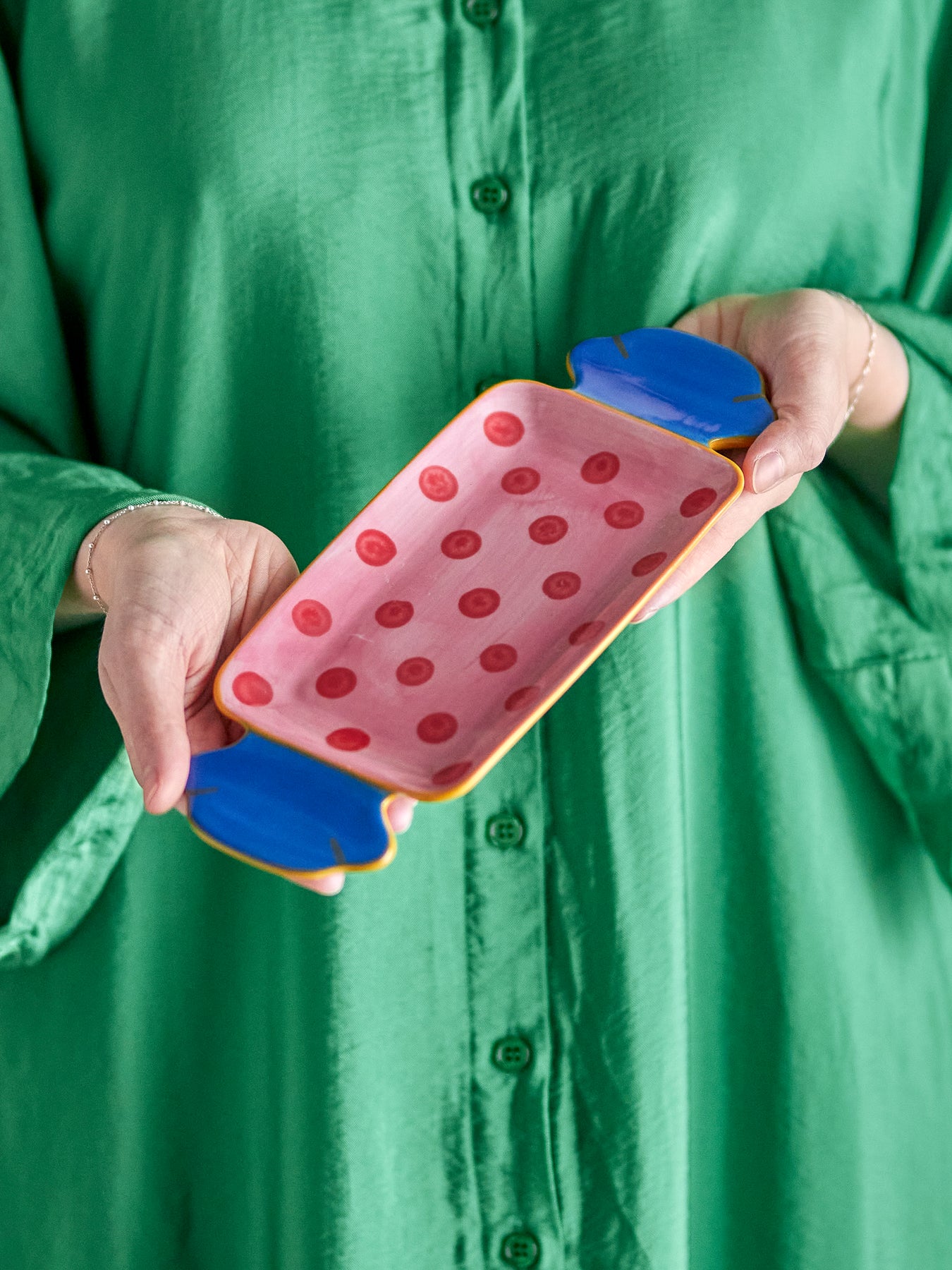 The Caramella Serving Plate by Bloomingville, shaped like a caramel, is adorned with hand-painted details that make each plate unique. Its vibrant colors and striking design bring a playful and colorful vibe to both casual meals and festive gatherings.