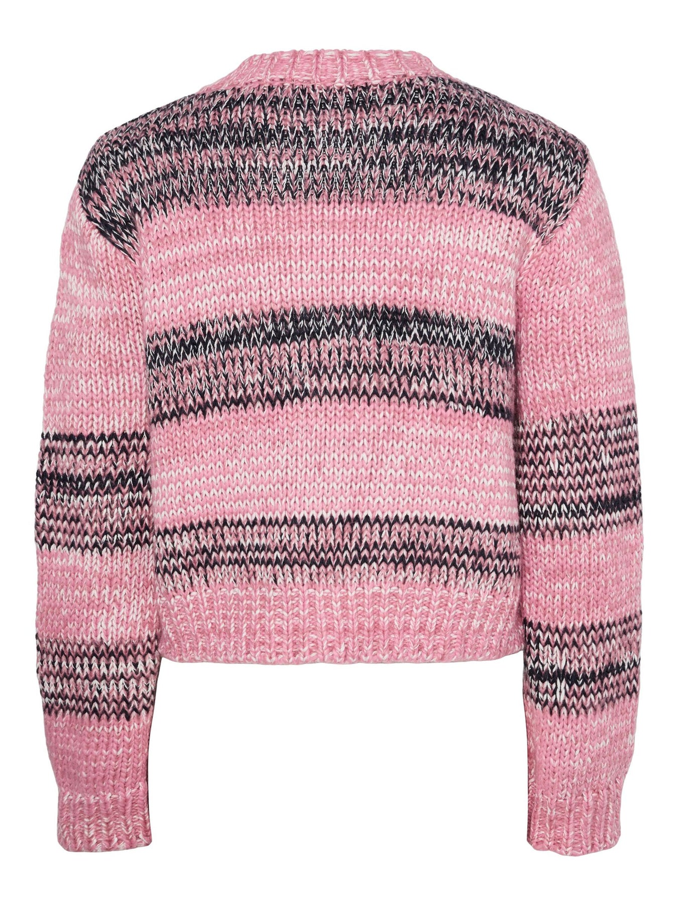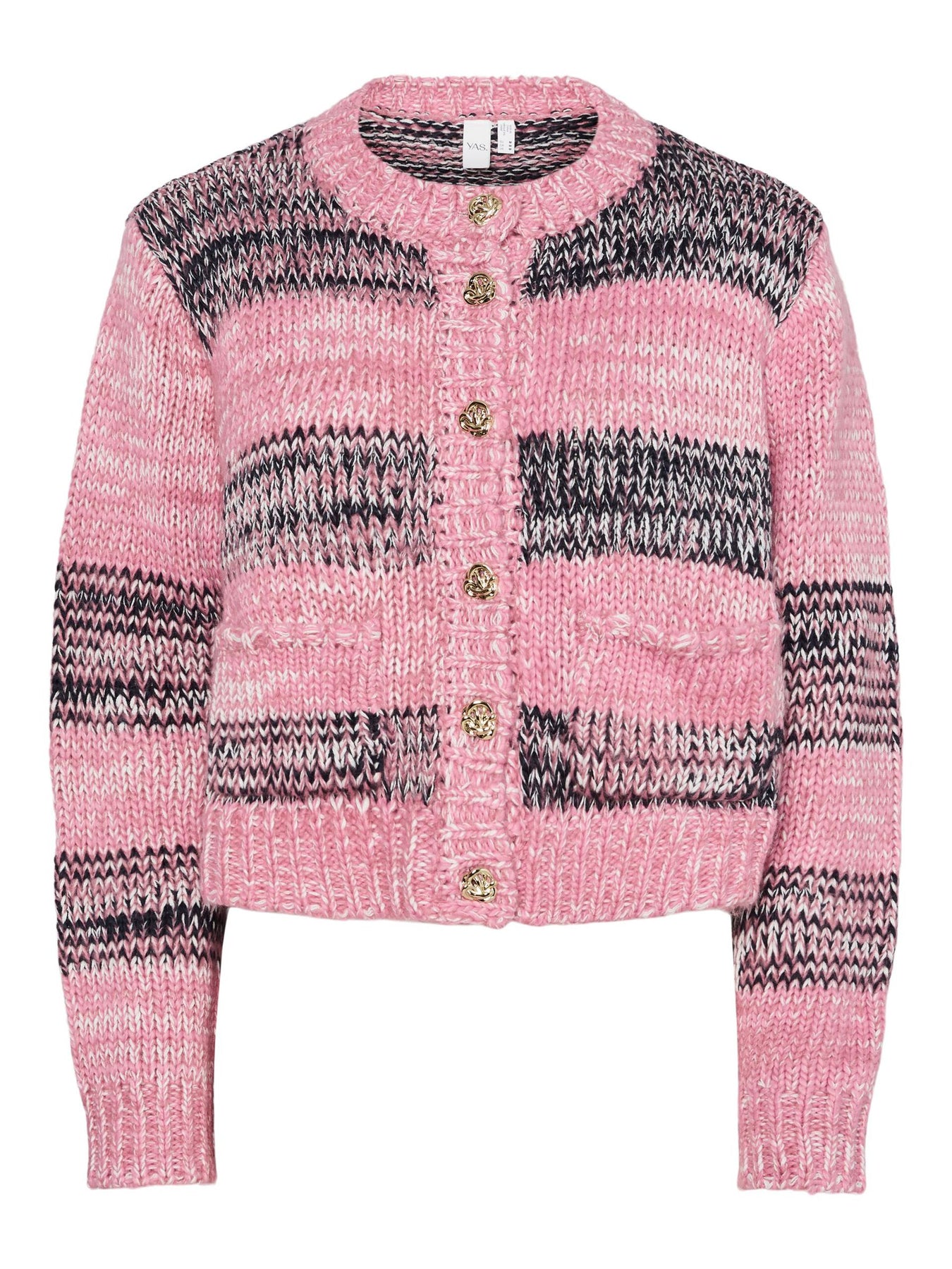 Bring a playful pop of colour to your knitwear collection with this YAS cardigan, crafted in a soft pink mélange with contrast navy marled detailing. Designed with a classic round neckline and long sleeves, it features intricate ribbed trims, front patch pockets and statement gold-tone buttons that add a refined touch. The chunky knit texture gives it a cosy, elevated feel—perfect for layering over simple tees or styling with tailored trousers for a chic contrast.