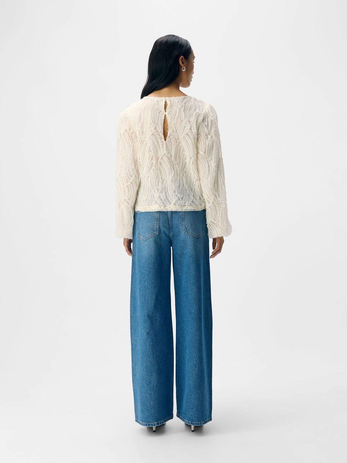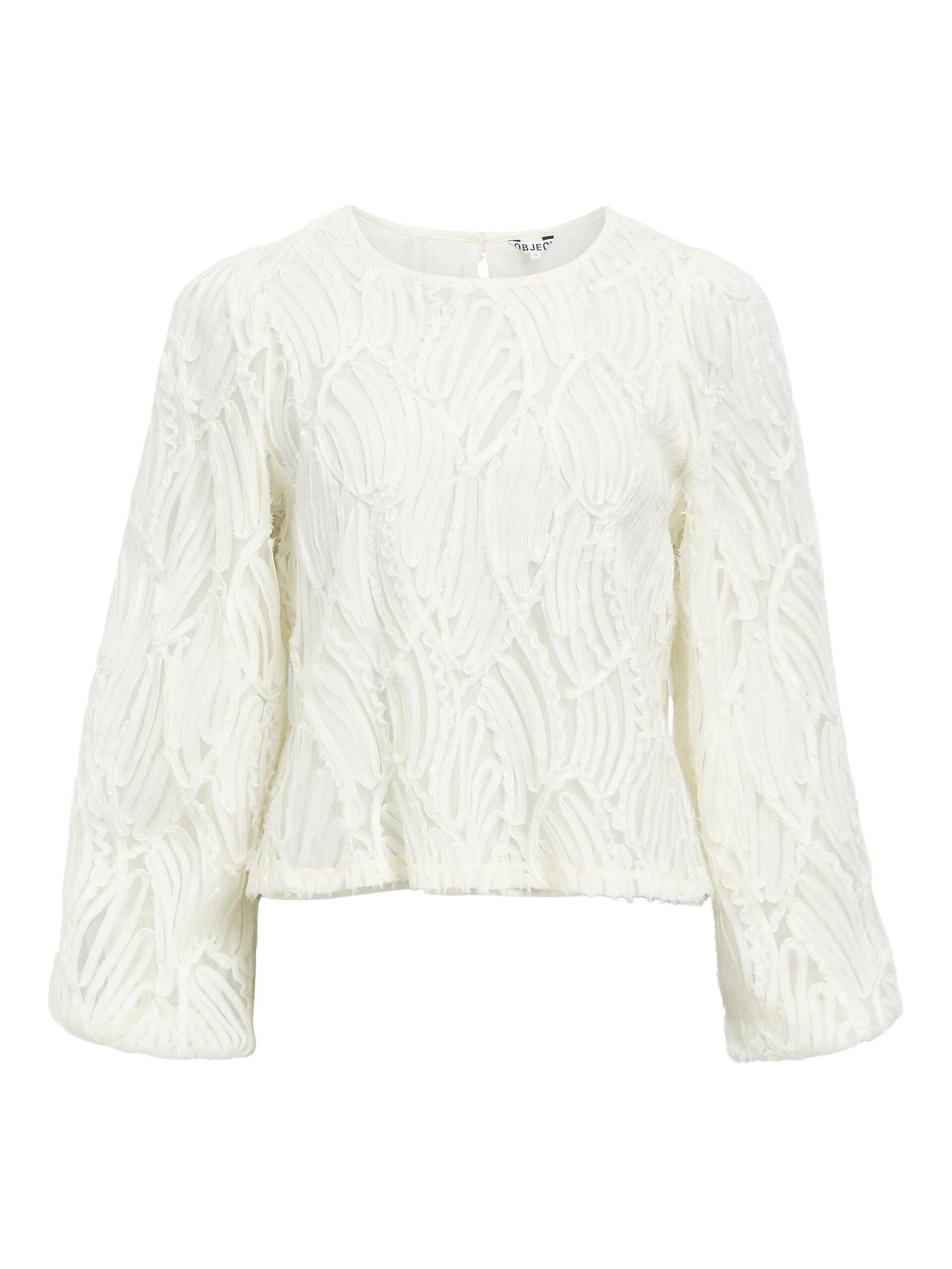 A delicate textured blouse featuring a round neck and keyhole back button fastening. Designed with airy long sleeves, elasticated cuffs, and a soft, sheer unlined finish. Super lovely blouse for dressing up!