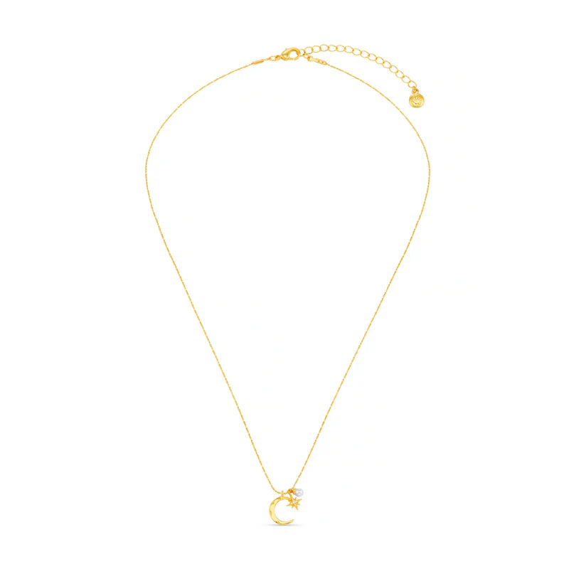 Capture the night sky with the Fine Moon & Micro Charm Cluster Necklace. A trio of refined charms, the moon, star and pearl accent charms delicately hang along a slender chain. A versatile piece for layering or a minimalist statement.