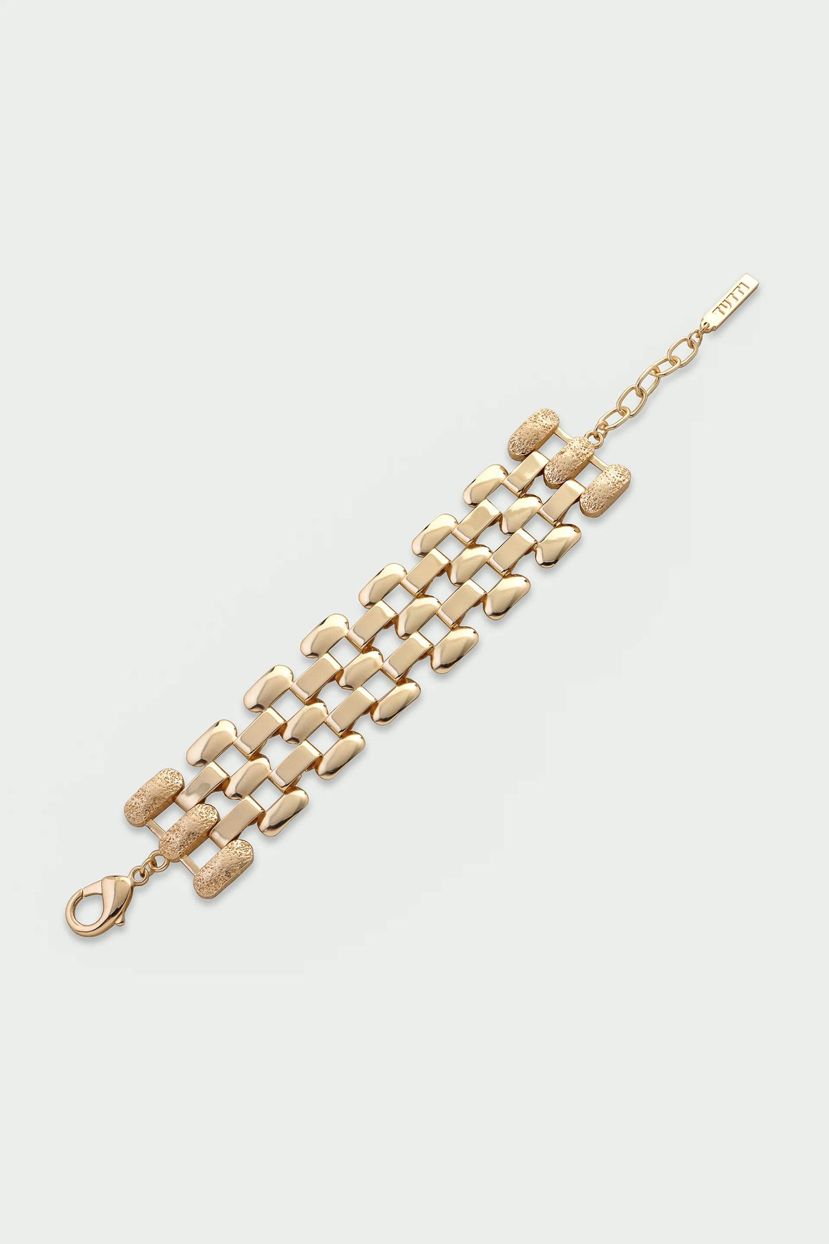 Bold, sculptural, and effortlessly sophisticated — the Linear Bracelet by Tutti & Co is a true statement piece. Designed with a striking double-row of interlocking rectangular links, this bracelet combines smooth and textured finishes in radiant gold plating for a contemporary, high-impact look.