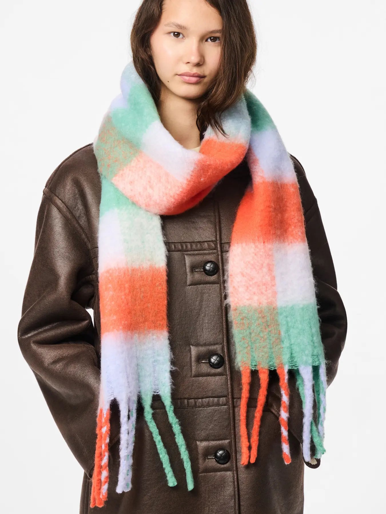 Add a playful touch to your cold-weather look with the PcBea Scarf from Pieces. This slightly narrower version of the brand’s beloved style features a bold, colourful check pattern in soft green, coral, and lilac hues. Crafted from a cosy brushed fabric and finished with long fringe detailing, it offers the perfect blend of warmth and vibrant charm — ideal for brightening up any winter outfit.
