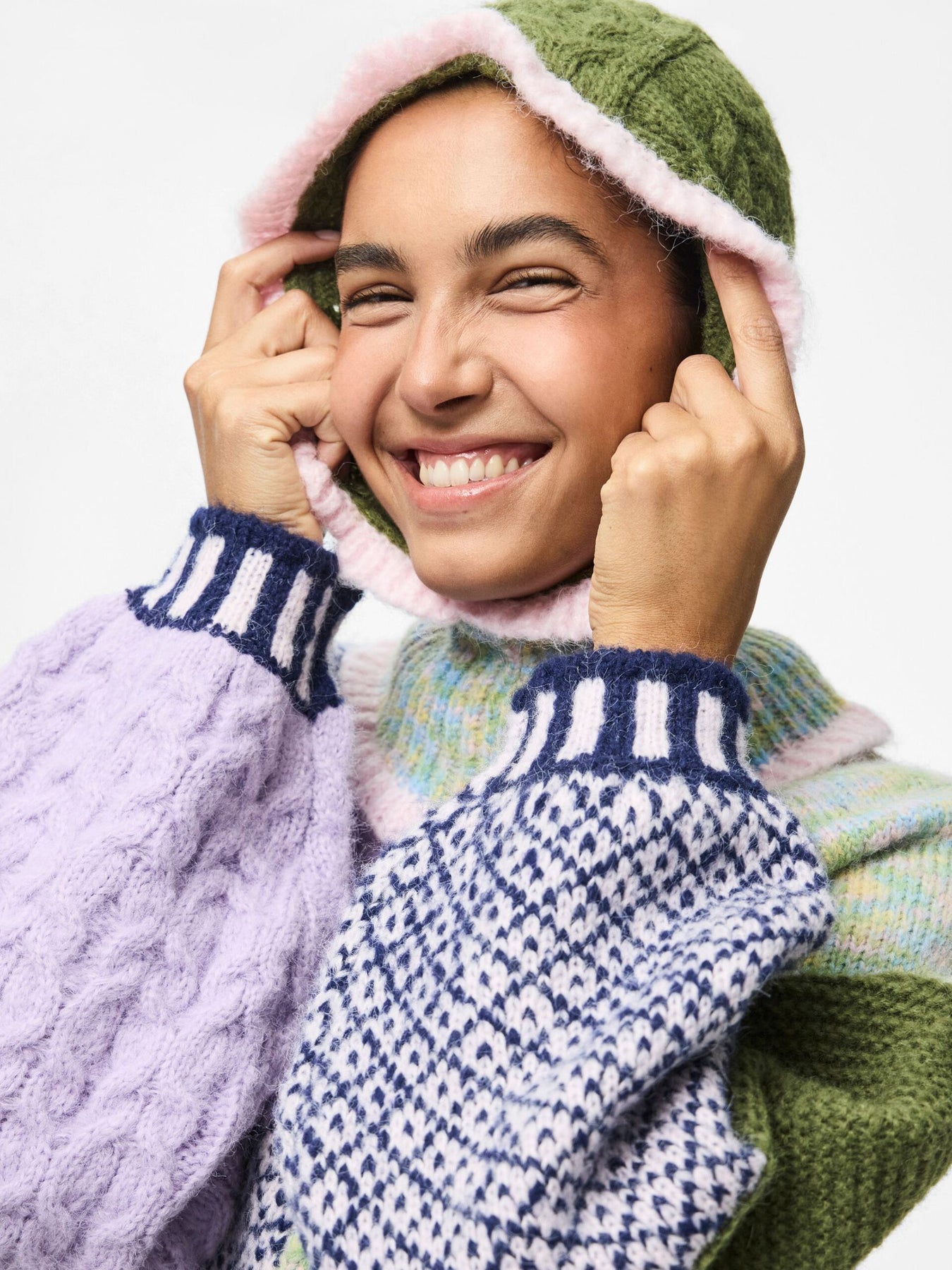 In shades of olive green with a pastel trim, it brings a playful contrast to your winter accessories.