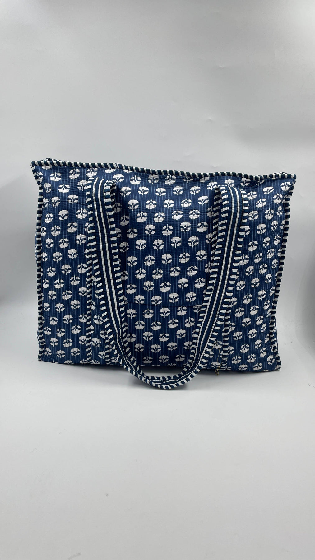 Kantha Quilted Blue/White Floral Tote Bag with Zip