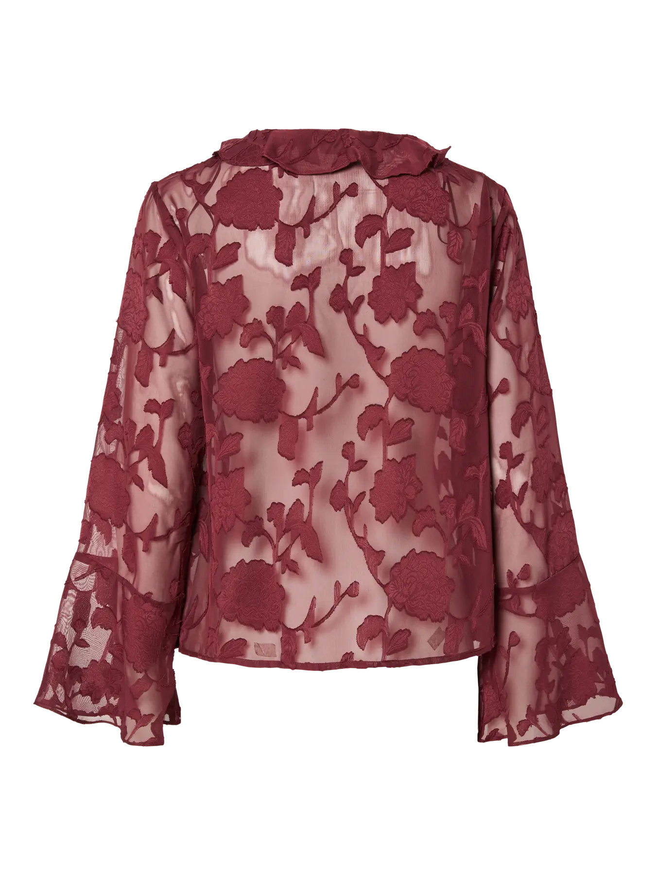 Elevate your wardrobe with this sheer floral blouse from Pieces in a rich burgundy hue. Featuring delicate floral detailing and a chic tie-detail, this dressy blouse with flared sleeves is perfect for both office (wear a cami/black roll neck underneath)-to-evening styling or special occasions.