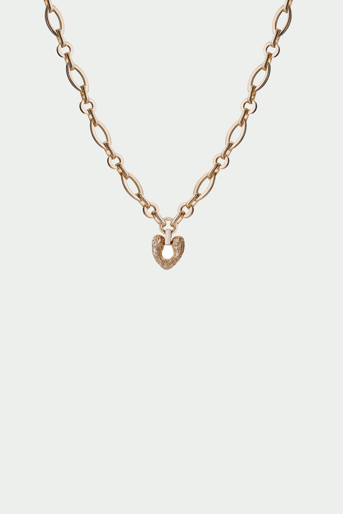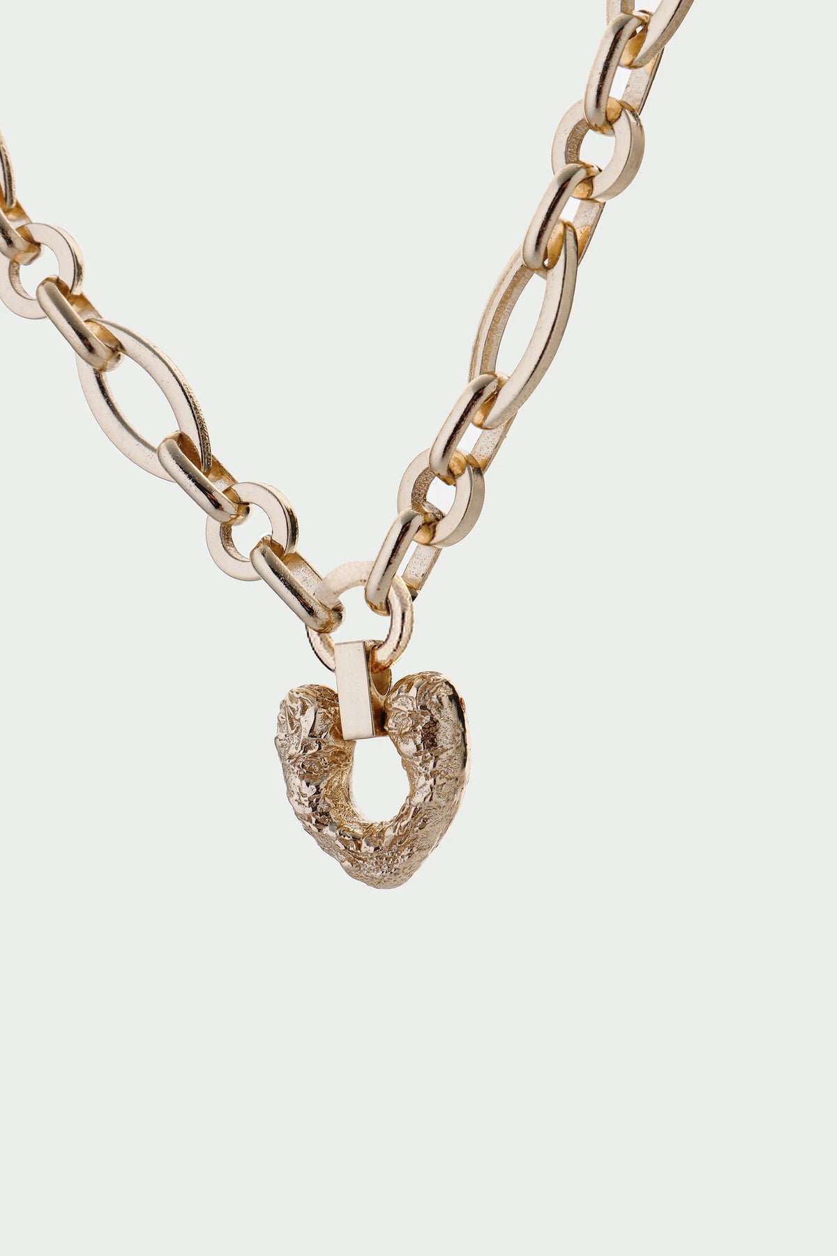 Featuring a textured heart pendant suspended from an oversized oval-link chain, this gold-toned necklace is both striking and meaningful. The unique molten finish adds depth and artistry, making it a timeless accessory with a contemporary twist.